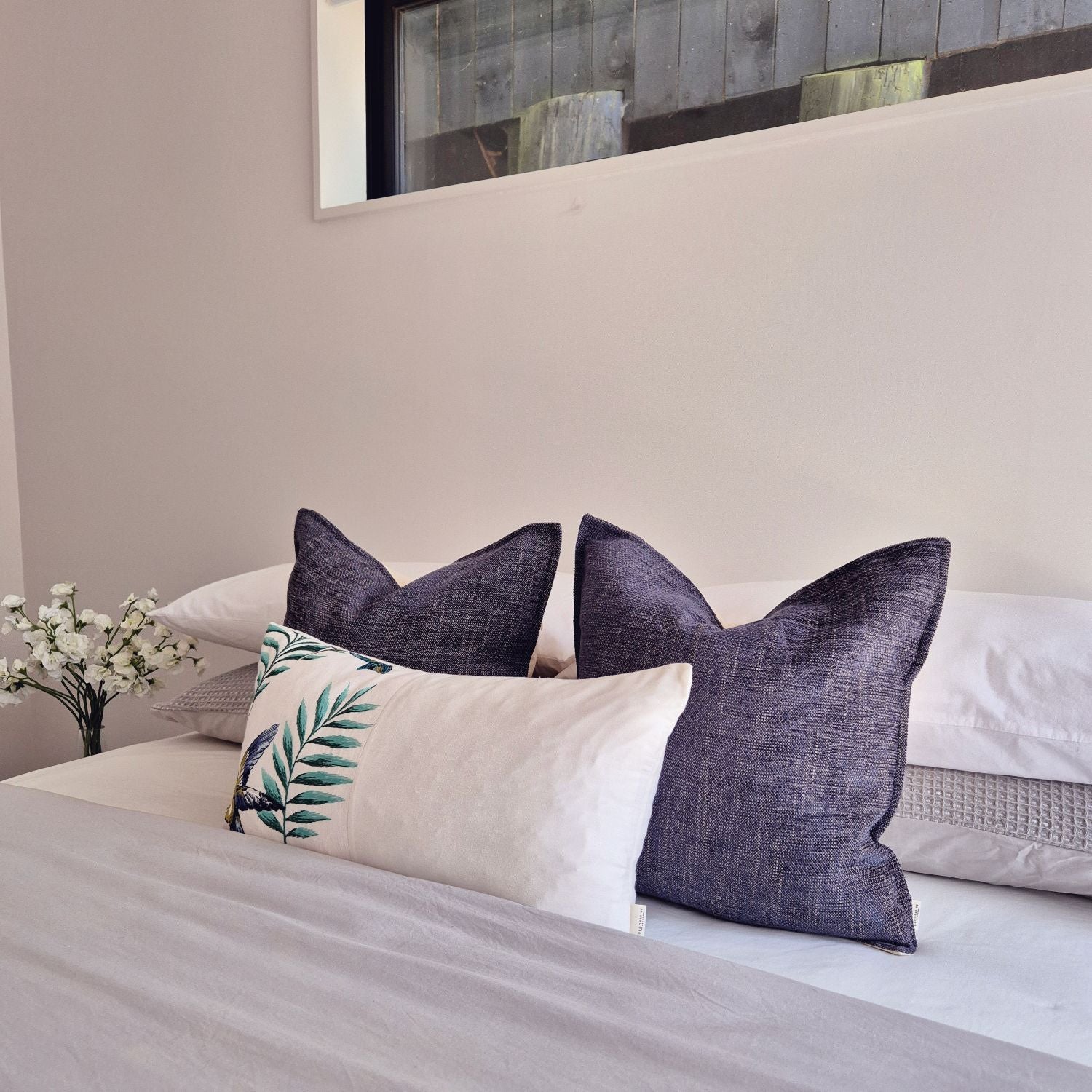 Our Avian cover is all about the detail, delicate hummingbirds in mid-flight, surrounded by soft, leafy botanicals. Meticulous stitching on premium fabric highlighting vibrant colours. The silvery, almost metallic sheen of the embroidered leaves adds a modern touch, giving the tropical design a fresh, contemporary feel.